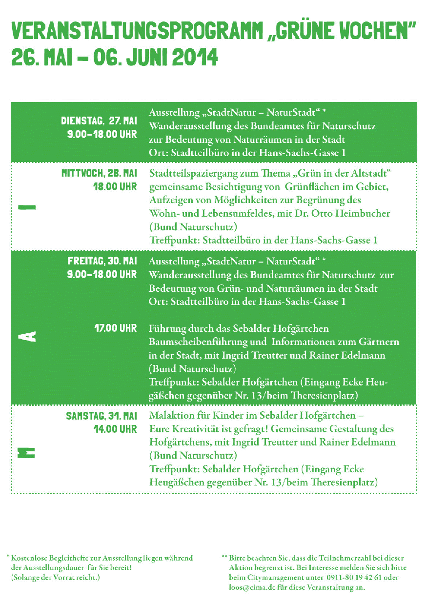 Gestartet wird mit den Grünen Wochen vom 26. Mai bis 06. Juni 2014. Das komplette Veranstaltungsprogramm finden Sie nachfolgend. Weiter geht es mit den Energie-Wochen im Juli und den Klima-Wochen im September 2014.