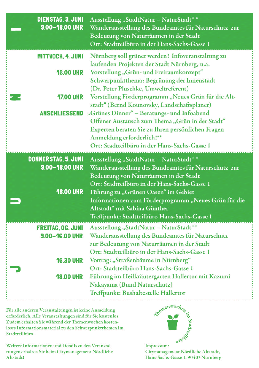 Im Rahmen der dreiteiligen Veranstaltungsreihe erwarten Sie kostenlose Beratungs- und Informationsangebote, thematische Stadtteilrundgänge sowie unterhaltsame Vorträge und Aktionen zu den Themen Nachhaltigkeit, Klima- und Umweltschutz in der Altstadt.