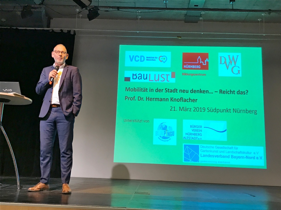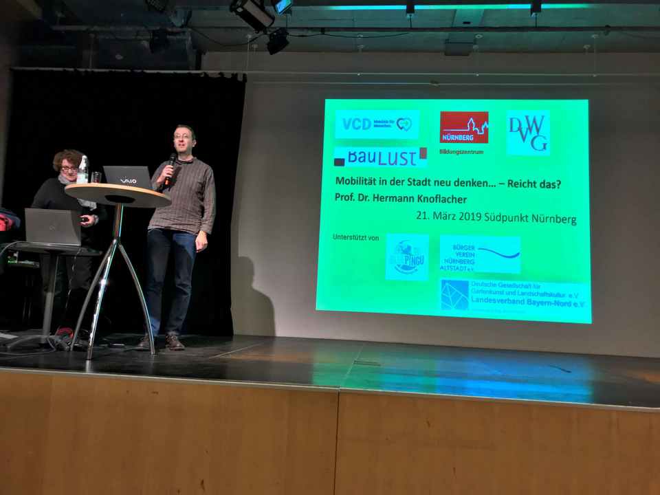 Das Denken seiner Zuhörer forderte er jedenfalls ununterbrochen. Was den Vortrag umso spannender und unterhaltsamer machte. Der, trotz Termin- und Raumverschiebung bis auf den letzten Stehplatz gefüllte Saal im Südpunkt ging bis zum Schluß mit. Vor allem weil Professor Knoflacher so manches, angeblich unumstößliche verkehrspolitische Postulat über den Haufen warf. In Nürnberg stehen wir bekanntlich vor vielen Aufgaben. Da sollte man sich öfters solche Denkanstöße trauen.